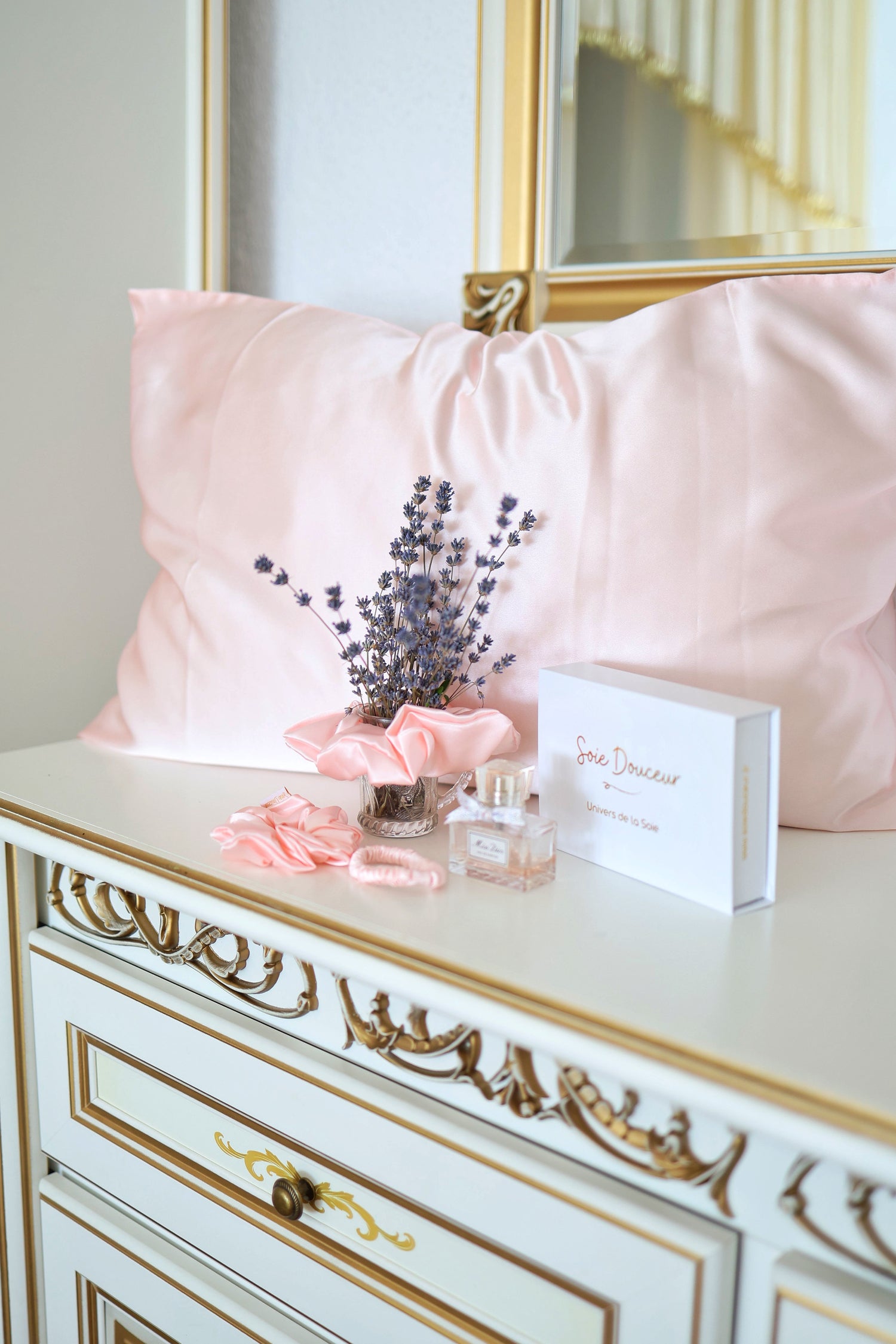 Grâce à ses propriétés hypoallergéniques et thermorégulatrices, la soie calme les irritations, retient l’hydratation naturelle et laisse la peau plus lumineuse au réveil.